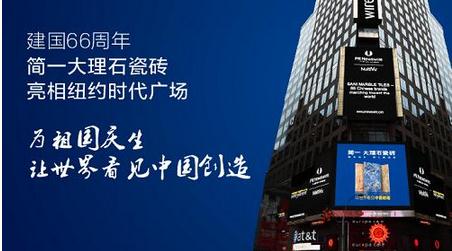 中国建国66周年,2015年国庆简一携手格力、华为、绿地等中国品牌亮相纽约时代广场。而在伦敦希思罗机场、巴黎戴高乐机场、德国法兰克福机场、美国旧金山机场等世界枢纽也活跃着简一的品牌宣传。