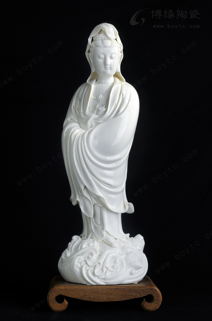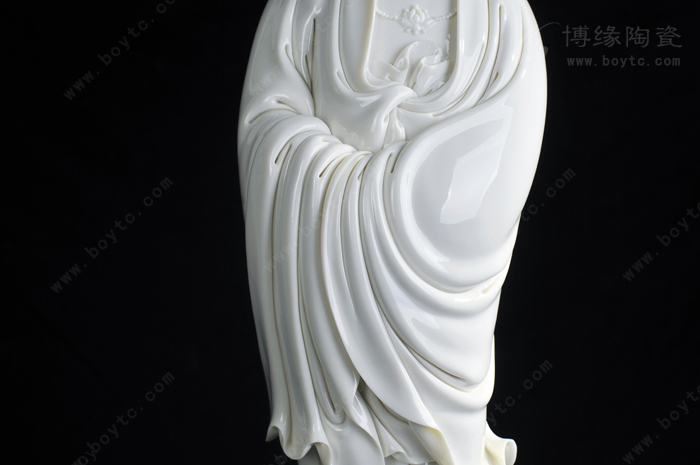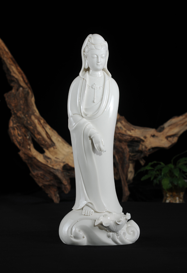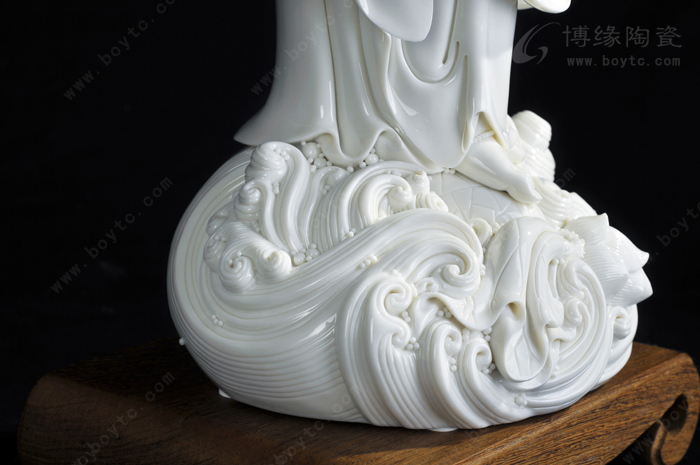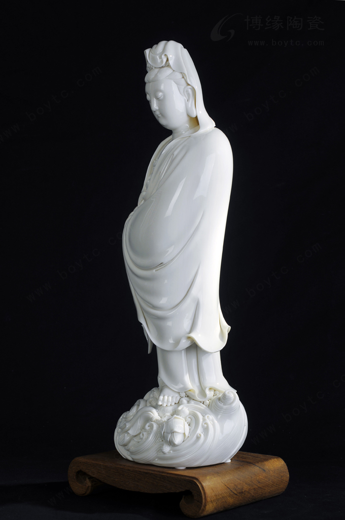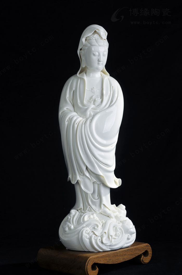 作品《渡海观音》以德化白瓷为胎质,圆劲有力如凝脂似玉,滋润莹滑。线条清晰、简洁、潇洒,多变化,柔媚流畅,翻转自然,观音双手藏袖,露一足踏莲花,另一足水花掩盖,作踏浪凌波渡 海之势。神情娴雅平静,安详自若,双目低垂凝思。整座塑像精巧细致,神态如生。该作品2013年被永久收藏于福建省非物质文化遗产博览苑。