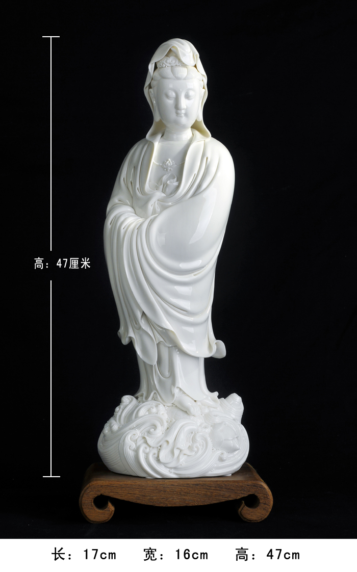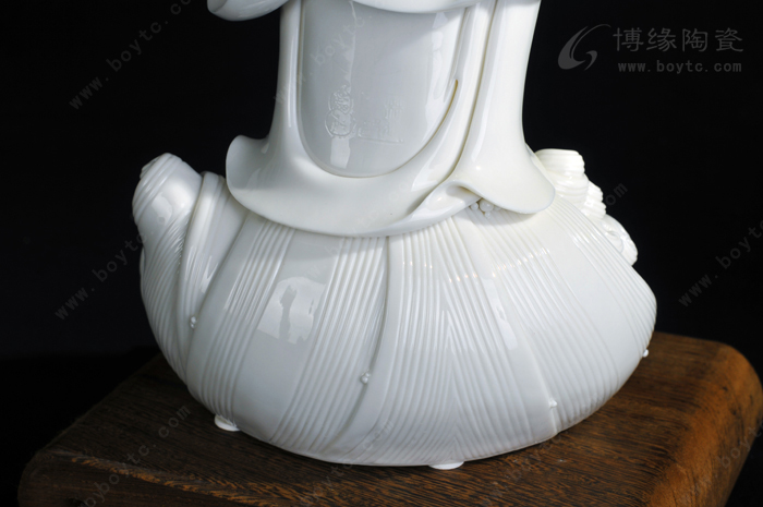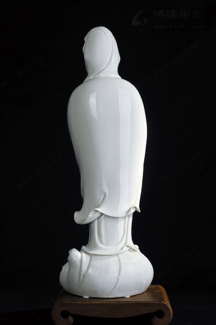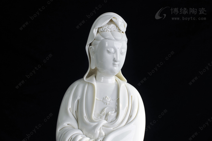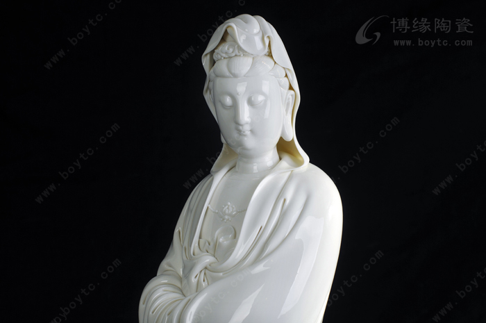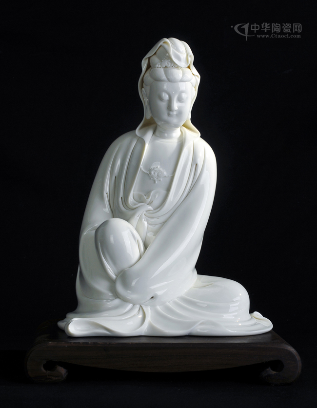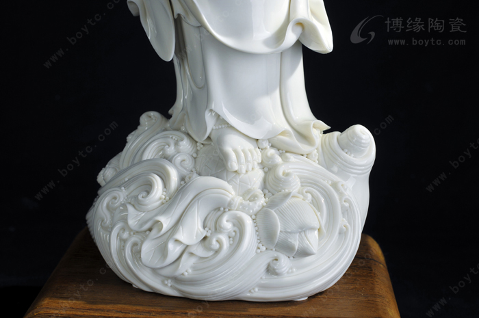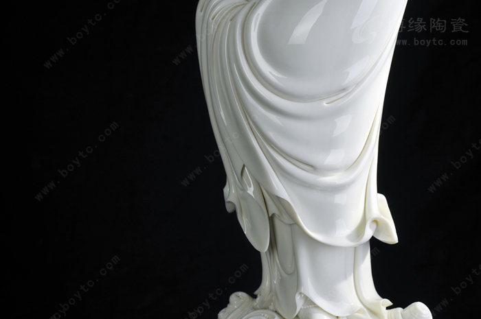 作品《渡海观音》以德化白瓷为胎质,圆劲有力如凝脂似玉,滋润莹滑。线条清晰、简洁、潇洒,多变化,柔媚流畅,翻转自然,观音双手藏袖,露一足踏莲花,另一足水花掩盖,作踏浪凌波渡 海之势。神情娴雅平静,安详自若,双目低垂凝思。整座塑像精巧细致,神态如生。该作品2013年被永久收藏于福建省非物质文化遗产博览苑。