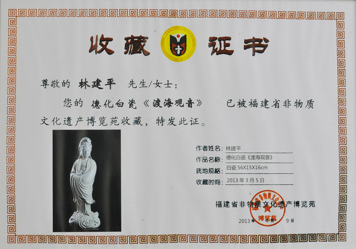 2013年3月作品《渡海观音》被福建省非物质文化遗产博览收藏