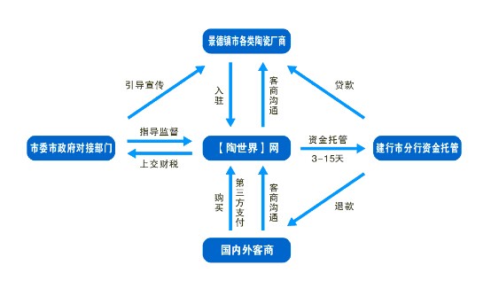 结合建设银行景德镇市分行对所有交易资金托管,保障了交易资金的安全,大大提高了买卖双方的公信力。通过多种推广方式,让国内外的客商第一时间看到发布的产品。保证了每天的交易数量,这样就把全市分散的商家集中到一起,统一对外宣传,改变了以往景德镇陶瓷市场分散零乱的现象。入驻商家还通过网站动态充分了解市场需求,针对市场要求专业创新制作,提高设计制作水平。市场开发拓展则完全交由【陶世界】网来实现。见如下框架图: