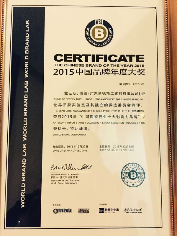 2015年12月28日,由世界品牌实验室(World Brand Lab)主办的“中国品牌年度大奖”发布会在北京隆重举行,广东博德精工建材有限公司旗下的高端品牌“博德”荣摘“中国品牌年度大奖——中国陶瓷行业十大影响力品牌”。哈佛大学商学院教授约翰·戴腾博士、耶鲁大学管理学院教授莱维·多尔博士出席了会议并为获奖者颁发奖牌。