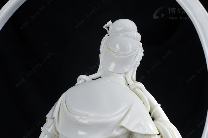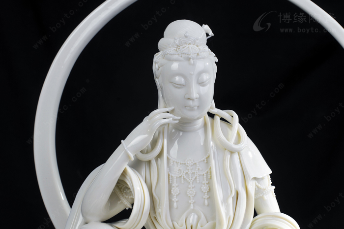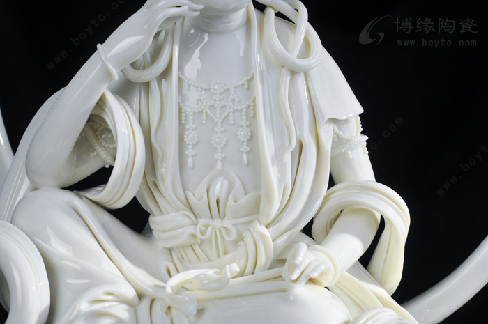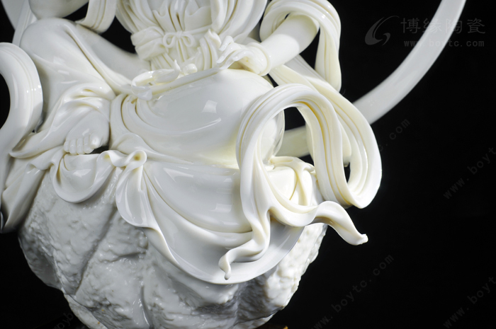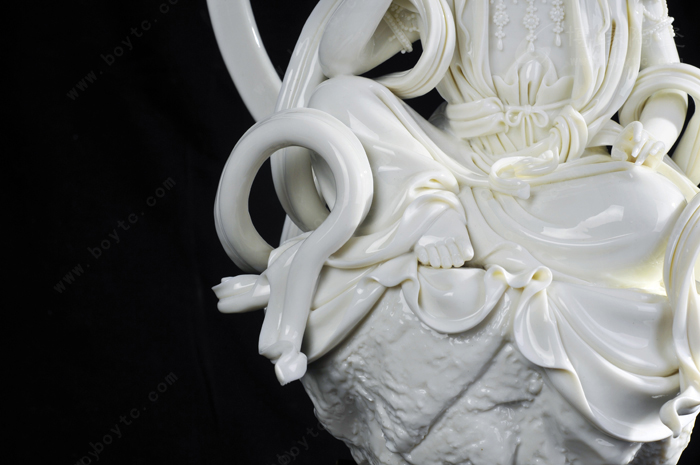 所以,许瑞卿作品自然也有了“山湖祖”对雕塑的精雕细刻的传统风格。那么,如何通过精雕细刻创作出具有价值的陶瓷艺术精品?许瑞卿认为首先在创作上应对作品的造型、整体和细节的关系作推敲。细节是作品整体不可分割的重要组成部分,缺乏细节的巧妙安排,作品就会缺少吸引力。表现杨贵妃醉酒后,由丫鬟扶住行走的瞬间的作品《贵妃醉酒》便是此技法的代表作之一。作品通过多个细节把贵妃醉酒后的形态充分地展示了出来:披肩褪至臂间,露出浑圆的香肩臂膀,丰韵的身躯轮廓分明,凹凸有致,丰满而不臃肿;稍稍倾斜的身躯把重心置于丫鬟身上,体现贵妃醉酒把握不住的步态,却依然妩媚而雅致;高高隆起的发髻和质地飘逸柔软的衣裙彰显出杨贵妃的高贵。在这件作品中,大到整体的构思造型,小到发髻牡丹、颈上环佩、腰间飘带都是精微细致的,极具真实感。另一件作品《静思观音》也是如此。坐于岩石之上的观音,略微右倾,轻举右手,若有所思,其发丝、发饰、胸饰、衣纹等无一不是精雕细刻,让人赞叹。