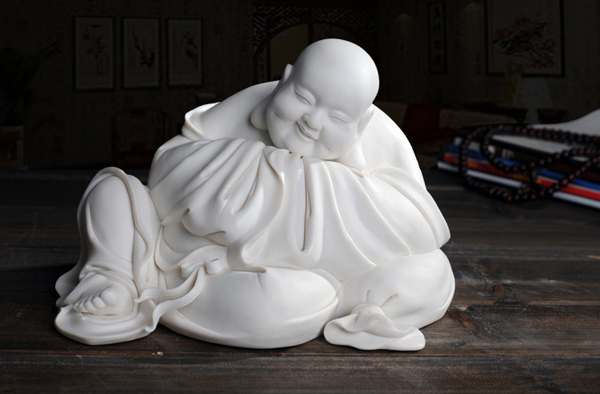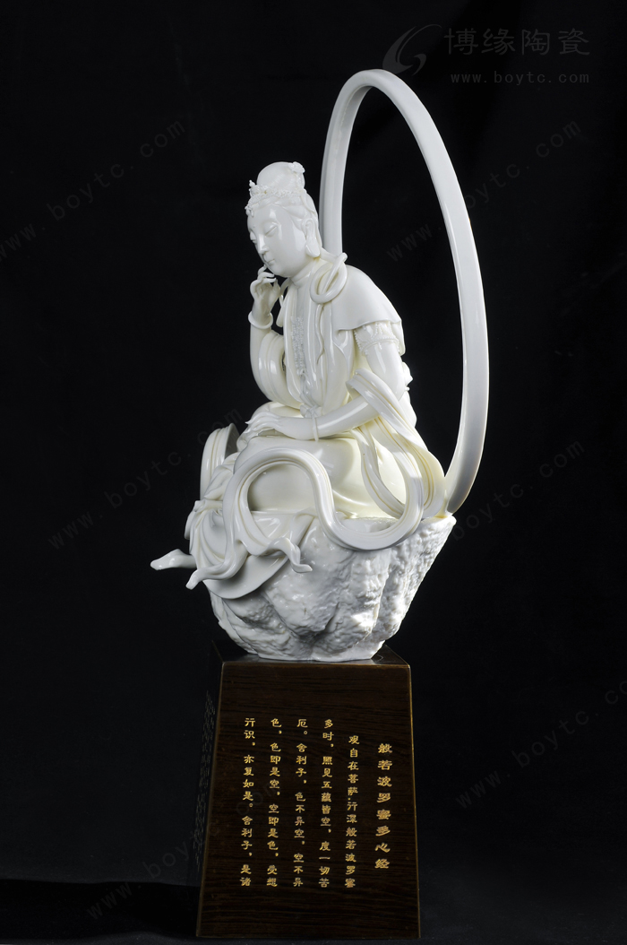 这就是不满足于停留在传承层面上,而是不断开阔自己的眼界与识度,自觉地在文化修养、社会活动与人生阅历等方面充实自己,形成自己更加开放的心境与更加豁达的胸怀,形成从工到艺、以艺带工的思想升华,从而走出一条具有鲜明时代特征与个性情怀的瓷塑创造之途。《禅心》系列作品便是在传统之余的创新之作。人物盘膝而坐,双手摊开轻轻放在膝盖上,头微仰面向天空,眼睛微闭,静心之意扑面而来。此作品借鉴了瑜伽的姿势造型,却在精雕细刻与抽象写意之间相生相融,相辅相成。