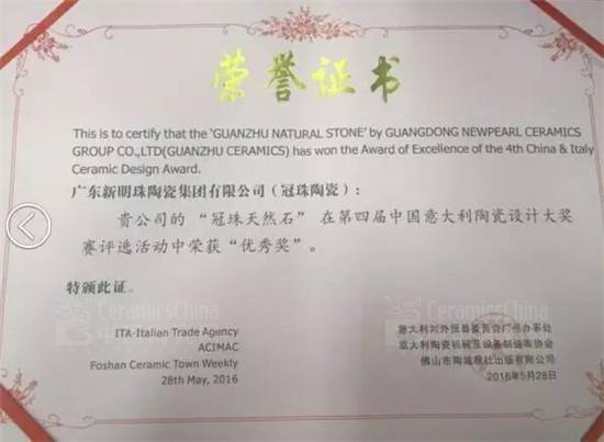 5月28日晚,由陶城报与意大利对外贸易委员会,意大利陶瓷机械及设备制造商协会,倾力打造的第四届中意陶瓷设计大奖赛召开。冠珠陶瓷天然石瓷砖荣获优秀奖。
