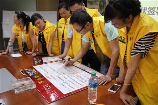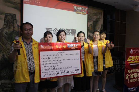 作为格莱斯陶瓷西南区域的重要区域之一,此次联动受到了厂家的高度重视,经过一个多月的前期沟通和准备,厂商通力配合,【决战工厂】第二季格莱斯陶瓷江西全省联动(吉安地区)顺利启动。格莱斯陶瓷西南大区经理曾颖在本次启动大会的致辞中作出了厂家的承诺,由厂家监督整个联动活动,号召各销售精英把优惠带给更多业主,并针对这次活动做出了清晰明确的工作指导,使参与活动的销售精英的步伐更为坚定不移。各小组代表充满斗志地签下军令状,这标志着活动正式启动!
