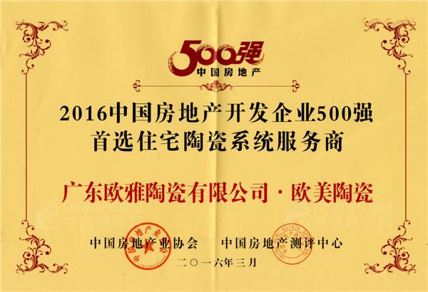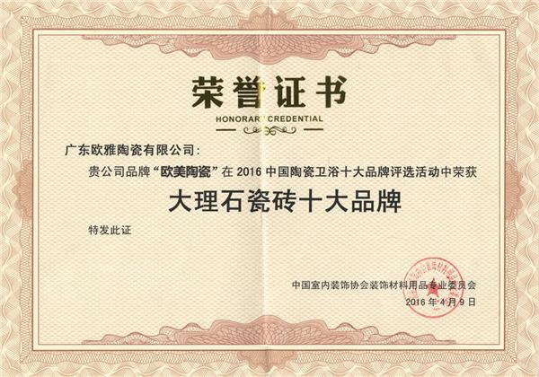 欧美陶瓷凭借卓越的品质、优秀的服务、先进的设计理念,亦赢得了专业人士和消费者的一致认可。2016年,欧美陶瓷先后荣获中国房地产500强开发企业500强首选住宅陶瓷系统服务商、2013-2015年度时代地产优秀供应商称号、中国陶瓷十大品牌、中国大理石瓷砖十大品牌殊荣、广东省著名商标、国家强制性产品“3C”认证、中国绿色建筑陶瓷推荐产品、国际知名品牌、中国轻工业陶瓷行业(瓷砖)十强企业等多项荣誉,这无疑又是一个实力的见证。在广东欧雅陶瓷集团全力推动下,更加彰显企业的雄厚实力与社会形象。
