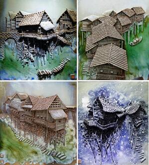 (2012美国圣地亚哥世界艺术博览会最佳创意奖作品、2013西湖国际艺术博览会春季展一等奖获奖作品《古镇》系列悬雕瓷作品)