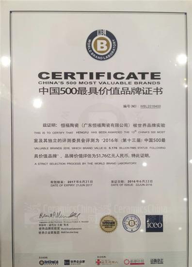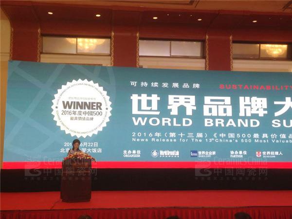 6月22日,第十三届世界品牌大会在北京中国大饭店隆重举行,恒福陶瓷市场部经理李玮应邀出席了峰会。在峰会上,由世界品牌实验室评定的2016年《中国500最具价值品牌》排行榜正式揭晓,代表中国最高水准的品牌国家队阵容隆重诞生。恒福陶瓷再次荣获“中国500最具价值品牌”荣誉,品牌价值由去年的43.79亿元上升到今年的51.76亿元。