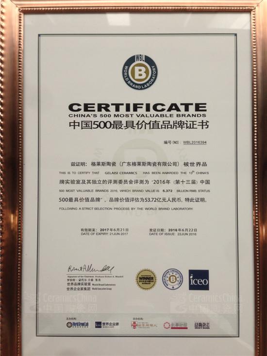 6月22日,由权威机构世界品牌实验室主办的第十三届世界品牌大会暨中国500最具价值品牌发布会在北京盛大举行。400多位企业首脑、100多位媒体领袖和媒体记者共同见证了2016年中国500最具价值品牌榜单的出炉。格莱斯陶瓷以53.72亿元的品牌价值再一次跻身中国500最具价值品牌,用实力诉说了格莱斯在行业中的地位,用权威再一次证明了格莱斯在消费者心中的价值。