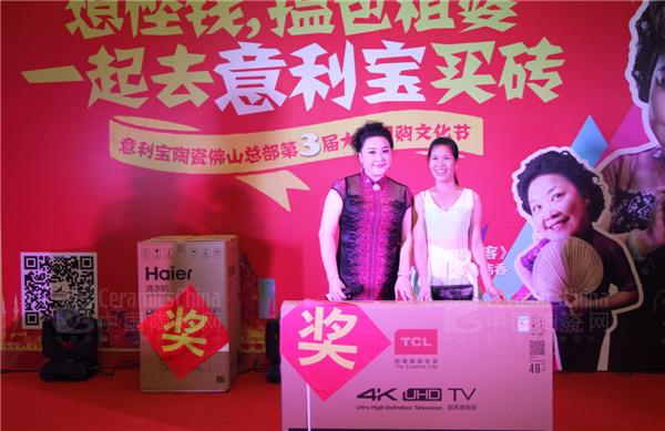 “好礼送不停,惊喜不停歇”,是本届意利宝团购节最大的亮点之一。本届意利宝瓷砖团购节可谓下足重本。小游泳池、电风扇到场有喜幸运抽奖礼,名牌洗衣机、多功能电饭煲、50寸液晶智能电视机等多个豪华大奖等待幸运业主临幸,现场领取下单礼品区,抽取劵区人头攒动,一轮接一轮幸运大奖的揭晓令现场氛围火热升温,让业主们笑不合拢,纷纷沉醉欢乐氛围之中。当八姑用音符幽默读出一等奖的幸运获得者是来自怀集的廖小姐时,廖小姐表示道,想不到自己会这么幸运获奖,这么幸运能跟八姑近距离同台合照。