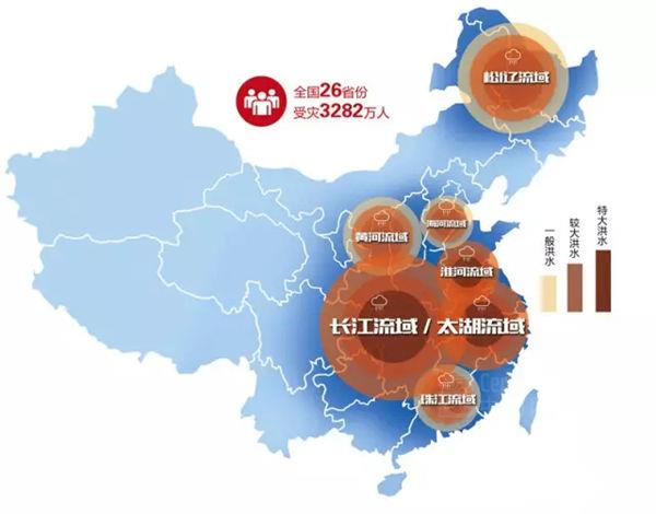 自6月30日以来,长江中下游沿江地区及江淮、西南东部等地出现入汛以来最强降雨过程。截至7月3日,全国已有26省(区、市)1192县遭受洪涝灾害,受灾人口3282万人,因灾死亡186人、失踪45人,倒塌房屋5.6万间,直接经济损失约506亿元。