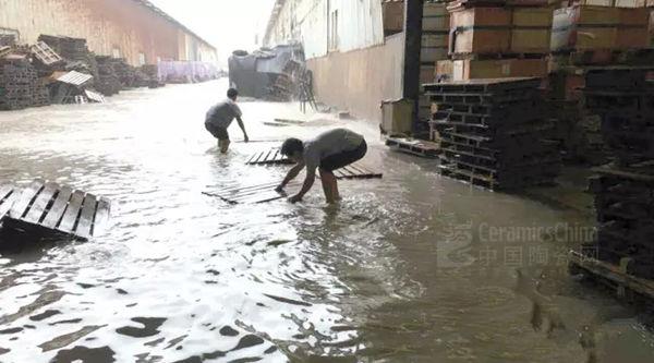 “马路积水最深的时候,有1.5m左右,现在马路上的积水还有50cm到60cm深。工厂里,原料仓和货仓都进水,最深都有50cm到60cm。所以这场大雨严重影响到了工厂的正常运转。”李昌进说,中陶实业原料车间和仓库积水,只好不停地用水泵抽出去,并在原料车间和仓库周边建起防洪墙,防止雨水回流回来,以保证连续生产。