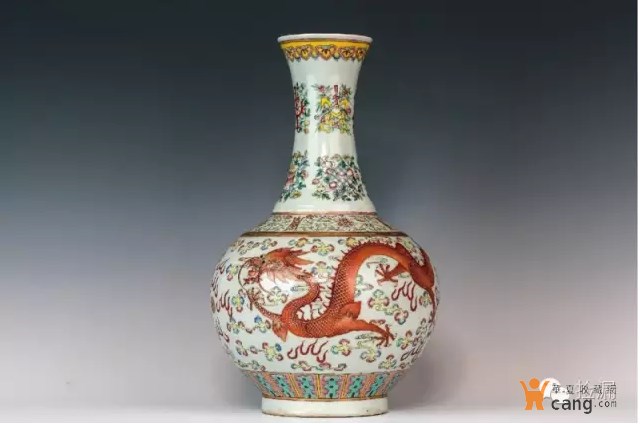 推荐理由:宣统款粉彩龙纹赏瓶,器型规整,五层纹饰清晰,上下如意锁口,瓶口分二层次绘暗八仙纹,瓶身画火焰龙纹,用彩明快亮丽,整体协调如一,应是清代晚期上品之作。、