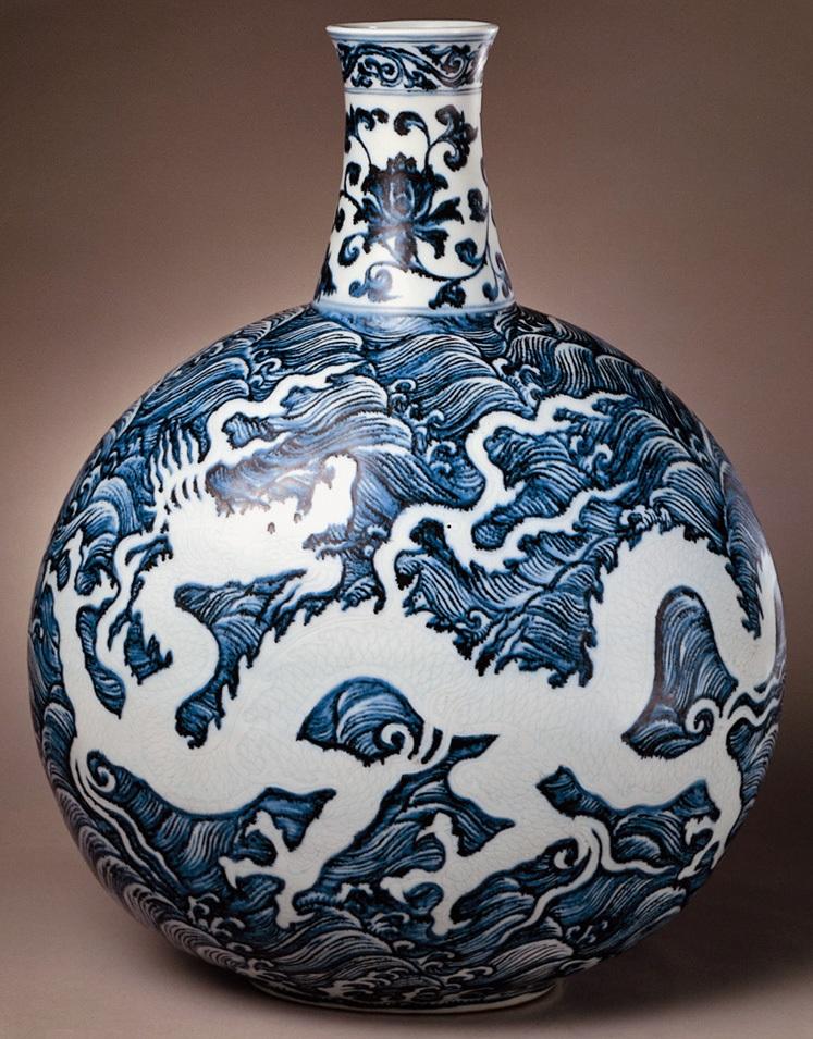 明代永宣两朝的30余年里烧造的青花瓷,在青花瓷烧造历史上堪称稀世珍品。其异域风格的造型、浓重明艳的呈色、超凡脱俗的纹饰,被后人赞誉为“发旷古之未有,开一代之奇葩”。永宣青花瓷代表了中国青花瓷制作的最高水平,它既不同于元青花瓷的热烈奔放,又有别于中晚明青花的典雅稚拙,更不同于清前期青花的明艳华美,它所体现的审美层次崇高而神圣,具有深邃无边的艺术底蕴。