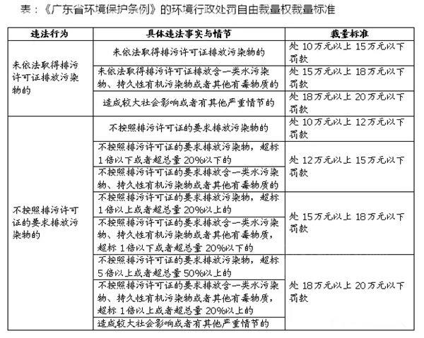 据了解,广东省环境保护厅最新制定了关于《广东省环境保护条例》的环境行政处罚自由裁量权裁量标准,在最新标准里,明确规定了各项违法行为的处罚标准,其中未依法取得排污许可证排放污染物的处10万元以上15万元以下罚款,如造成较大社会影响或者有其他严重情节的,处18万元以上20万元以下罚款。