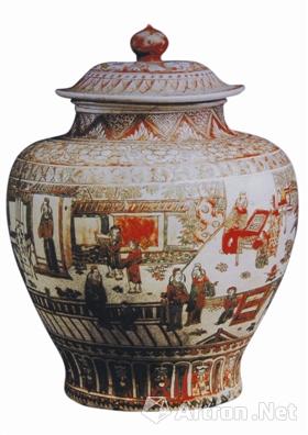 此罐系传世品,底无款,通高40.2厘米,口径17.5厘米,腹径33厘米,现珍藏于北京艺术博物馆。与它相同的另一件,收藏于英国维多利亚工艺博物馆。罐从上至下共绘12层纹饰,腹部主题纹饰是明代瓷器上常用的“琴棋书画图”,但此装饰内容更为丰富,生动地展现了明代文人雅士的风采。它的艺术价值,除人物形象生动,色调浓艳热烈,装饰细密繁复外,还在于把嘉靖时期一些较冷癖或独有的边饰神奇地集于一身。譬如器盖下方部位的两层装饰,譬如颈部纹饰中与锦地纹对应的那半截朵花纹,又譬如肩腹间的扇形纹样,这些都是嘉靖年间曾昙花一现的边饰,不但新颖,而且由于罕见,至今还无法给出合适的名称。