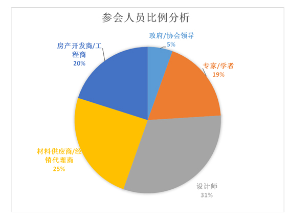参会人数达到2037人,其中政府部门/协会领导占总人数5.5%;建筑及建材行业领域专家、学者占总人数18.5%;设计师占总人数31.4%;材料供应商/经销代理商占24.5%;房产开发商/工程商占总人数20.1%