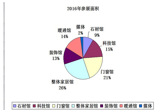 石材馆占9%;科技馆占15%;门窗馆占21%;整体家居馆占26%;装饰馆占13%;暖通馆占14%;媒体占2%