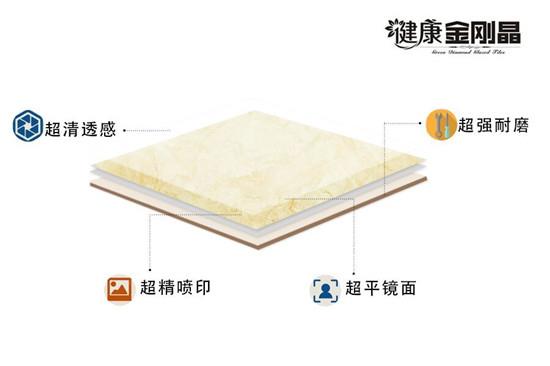相比普通抛釉砖,健康金刚晶系列产品在透感与光亮度上有了极大提升。生产过程中添加了独特金刚颗粒以及全新进口釉面料,从底釉、面釉、保护层等不同层面加以创新。产品经过1250度恒温烧制,在砖面形成无孔玻化表面,釉面厚度比普通抛釉砖提升了3倍。成型后的产品采用“硬抛+软抛”的精抛工艺,从根本上抚平普通抛釉砖的“水波纹”倒影,使砖面真正做到平滑如镜,有效保护砖体的同时透感十足。