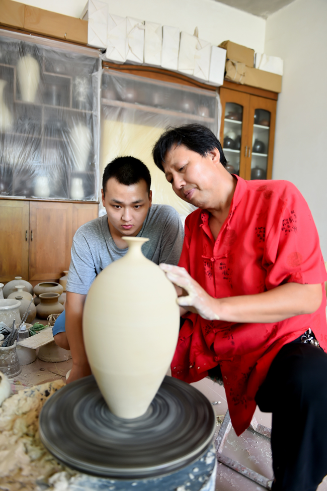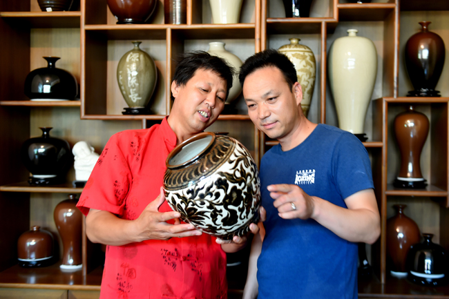 马会昌与到访的阳泉市收藏家协会盂县分会会长高飞研究定窑瓷器
