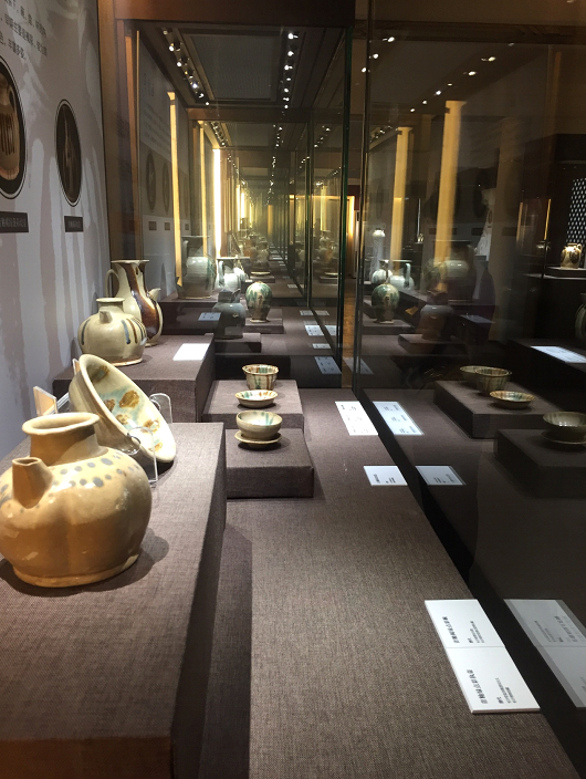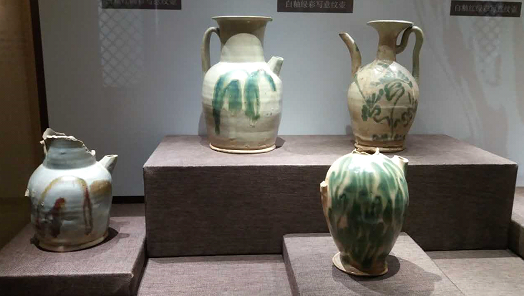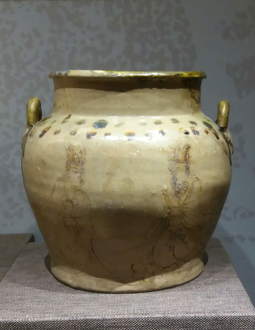 长沙窑蕴含许多西域文化元素,包括造型、装饰手法、装饰纹样等,如受萨珊波斯金银器影响的模印贴花纹样往往涂成褐斑,以彰显装饰图案。此次展览就有多件这样的器物,包括一件体现西亚风情的胡旋舞图案双系壶和一件椰枣图案双系罐。