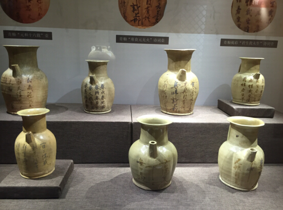 文字和绘画在瓷器中找到新的载体,是从长沙窑开始。长沙窑瓷器的绘画题材非常广,有动物、花草、人物、山水、云气、建筑等各类题材。工匠们还大量用诗歌、警句来装饰瓷器,有的瓷器上甚至包含有校对符号。下图是已发现的长沙窑瓷上惟一一件诗与画结合的“竹林七贤诗画罐”,人物在一面,诗在另一面。