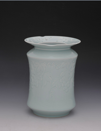 夏侯水平作品:造型新颖,釉色纯正如玉,手工拉坯成型,装饰到位,以葡萄小鸡为题,彰显农村自然风貌,画面采用阳刻真实自然,给人以浓郁的乡风民俗美好光景。