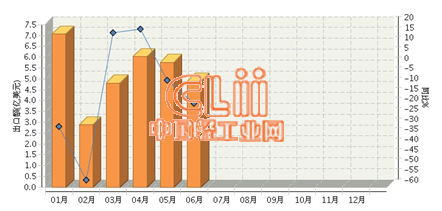 2016年1~6月,仅3、4月份出口额同比正增长。1月份出口7.06亿美元,为上半年单月最高出口额;2月份出口2.89亿美元,同比下降56.35%,当月出口额、出口增速均为上半年单月最低值;4月份出口6.04亿美元,同比增长17.76%,为上半年单月最高增速,详见图2。