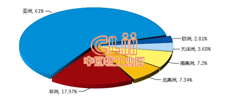 图1 2016年1~6月我国陶瓷砖累计出口额各大洲占比情况