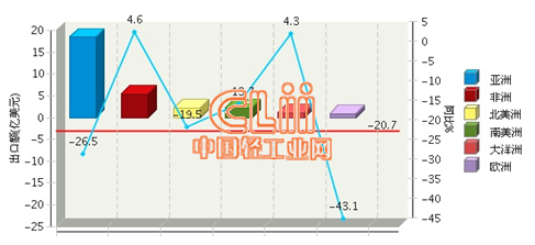 图2 2016年1~6月我国陶瓷砖累计出口额各大洲同比情况