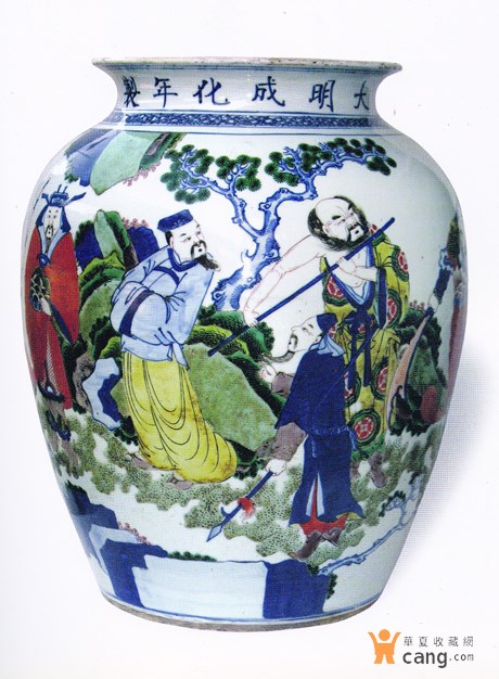 这件清五彩水浒人物故事罐,高16厘米、口径26厘米,无盖,口沿外撇,溜肩,鼓腹下收,圈足。从肩部到底部,周身遍绘山峰、岩石、松柏及水浒人物图案。作品选取了几位具有代表性的梁山好汉,或身披铠甲,或日常便服,或官服加身。只见在山崖之畔,松柏之下,宋江身穿大红的朝廷文官服饰,头戴官帽,面容温和慈祥,一副志得意满的神态,显然此时已经接受朝廷招安。左边的是军师智多星吴用,眉清目秀,面白须长,正侧身而视,一身平民便装,灰袍黄裙,便帽布鞋,与一身官服的宋江形成鲜明的对比。在他的旁边是金枪手徐宁和花和尚鲁智深,一上一下,胖瘦分明。鲁智深浓眉阔额,袒臂露胸,身形魁梧,不愧倒拔垂杨柳的英名。徐宁长袍红裤,须发飘拂,身手敏捷。与徐宁手执成名兵器钩镰枪不同的是,鲁智深并没有使用惯用的水磨禅杖,而是执棍挥舞,勇态毕显。此外,身为梁山马军五虎将之列的大刀关胜和双鞭呼延灼均是身穿铠甲,手执各自兵器青龙偃月刀和水墨八棱钢鞭。人物神态生动,动态逼真。