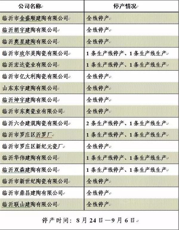 9月4日至9月5日,G20峰会将在杭州召开。期间,临沂市将对建陶企业实行停产、限产。据悉,罗庄区共有55家陶瓷企业被停产、限产,涉及62条生产线,停产时间从8月24日至9月6日,共计14天。