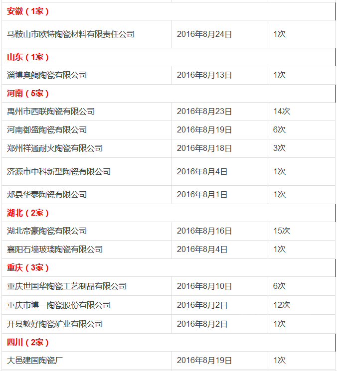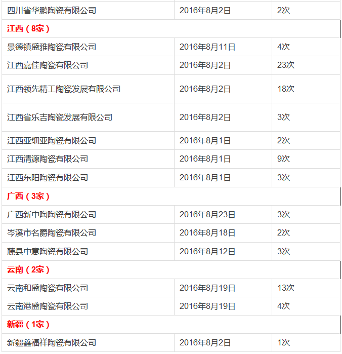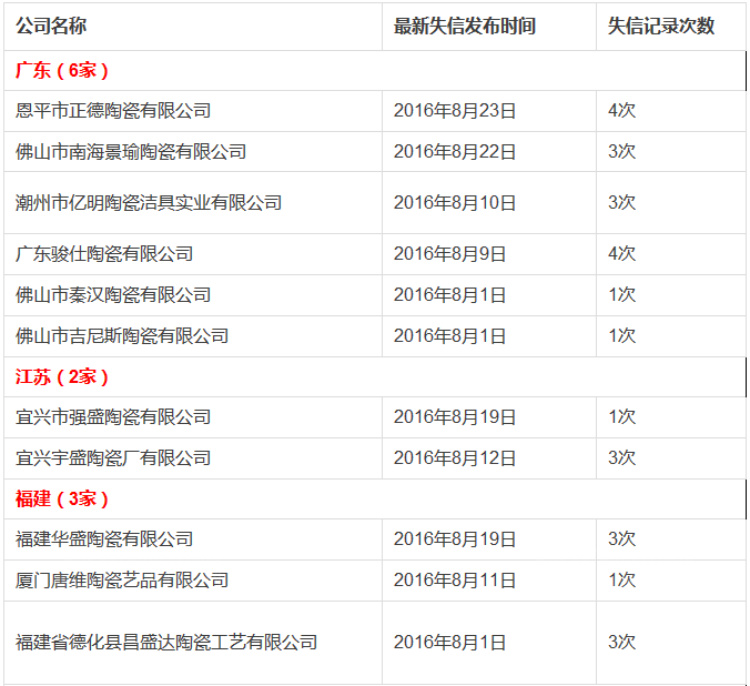 据最高人民法院及各地法院发布的失信被执行人信息统计,2016年8月,全国各地约有30余家陶瓷企业上榜“失信被执行人”名单,原因主要为欠款不还,大部分为拖欠供应商货款、拖欠工资、欠银行贷款未还以及拖欠融资租赁租金等,有企业失信金额大,已超千万元。其中,不少陶企有重复失信记录,最多者竟达20余次。