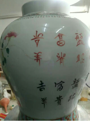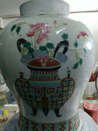 第三步是待古瓷拼装完整后,再做底色化妆及画青花等彩色和上釉。釉是一种新型仿釉涂料,如聚酯等。上完釉后器物表面光亮,硬度高,装饰性强。有时口沿的青花直线,它中间深、二边淡,有如国画的墨韵,若隐若现,虚中有实。他说在处理口沿时,应选择手工描与机械喷的工艺相结合,才能做到天衣无缝。最后是用地板蜡罩光。经修复后的古瓷,光彩如初,重现原貌。