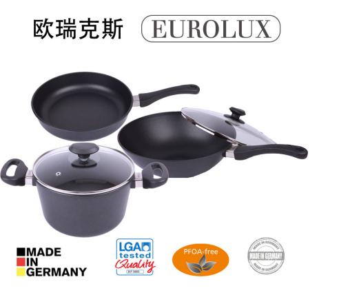 欧瑞克斯Eurolux不粘锅系列锅具采用符合欧盟标准的食用级铝合金,不含重金属铬。铝制基体厚度8毫米,底盘厚度10毫米。