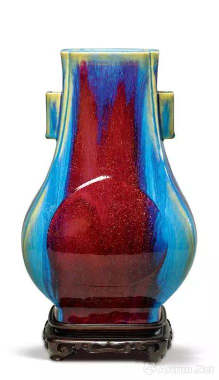 窑变釉贯耳瓶为清代官窑传统样式,通体光素仅以釉色丰富的变化为饰,为清宫一道釉瓷器之经典器形。