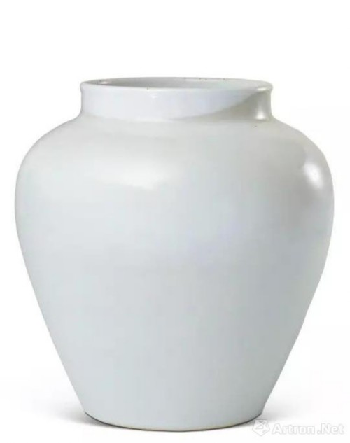 罐唇口短颈、丰肩垂腹、弧壁下敛、平底卧足,敦实浑厚。通体施白釉,釉色白润,施釉颇厚,质感厚重。底部无釉,足露涩胎,胎质坚致精良。清代对前朝名品的摹制竭力钻研,对于永宣成三窑佳器至为推崇,不独青花一项,白釉烧造亦是成就斐然。本品便属清代早期较为难得的此中佳例,为摹制永乐甜白瓷之典型器。