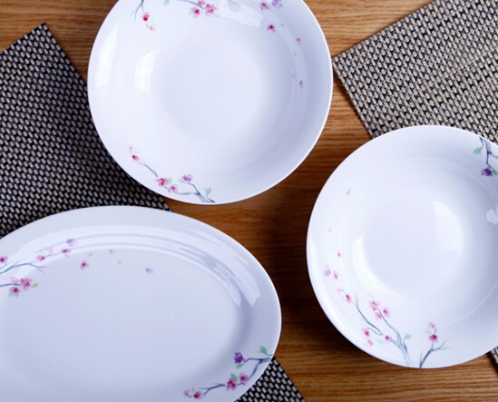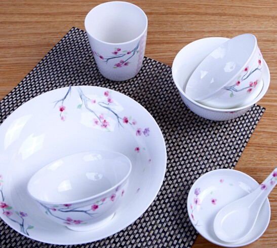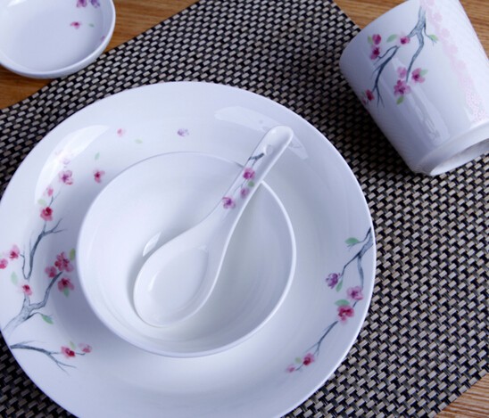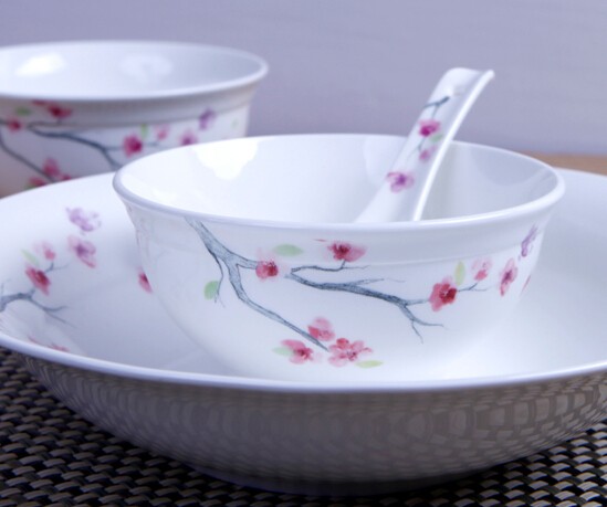 红花、绿叶,读着俗套的文字,看着却是美景一片,尤其用中国独有的水墨画着墨,趣意春意盎然。松发月光瓷淡墨春色餐具在杯 盏之边描摹春色花枝,略施淡彩的中间画,多姿多彩的墨趣,其层次之多和意外之变化都是任何色彩都难以奏效的;而在藤子上线条边缘有一种特殊的深水效果,枝 头的红花仿佛开在洁白的骨瓷之上,仿似从雪里破土而出的红,在雪白的世界里可爱非凡。