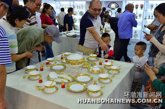 在本届展会上,一层的陶瓷精品区汇聚了国内外最新陶瓷制品,唐山红玫瑰陶瓷制品有限公司参展的红玫瑰骨质瓷堪称国瓷,手绘G20国宴用瓷和“蓝色梦幻” “飞鱼”“百鸟朝凤”系列用瓷,彰显出代表“北方瓷都”百年陶瓷历史的瓷艺瓷韵。唐山天目釉彩浓缩而成的“天花”结晶陶瓷日用品别有洞天,其专为我市即将举行的金鸡百花电影节设计的“金鸡鸣唱”工艺瓷、“花开满园”茶具,不时引来市民拍照参观。