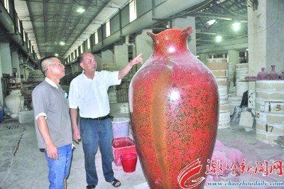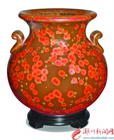 就这样,烧了砸,砸了烧,不计成本,巨资抛掷,不觉13年过去了。2003年的一天,当林礼腾打开窑炉,一只绚丽夺目的花插赫然呈现在他的眼前。成功了!自然形成的点点红斑,布满花插周身,就像是13年洒下的点点心血。“真的兴奋得几个月睡不着觉!”说到此处,林礼腾再次向记者强调。