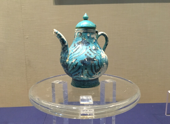 修复后的孔雀绿釉青花鱼藻纹梨形壶