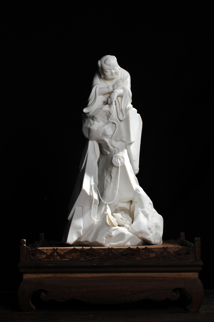 刘海笑容满面,赤足交脚坐于岩石之上,右手执一枚金钱正逗弄一只三足金蟾。作品人物神态憨厚,造型生动,衣纹柔软飘拂流畅,形神兼备,妙趣横生,为人们所喜闻乐见、雅俗共赏,又寓意招财进宝。作品瓷质如脂如玉、晶莹剔透,限量发行,限量99尊,具有较高的艺术欣赏及收藏价值。 2013年10月作品荣获2013中国工艺美术精品博览会优秀作品‘金’奖; 2013年10月赠送给巴西总统作为国礼并颁发证书。