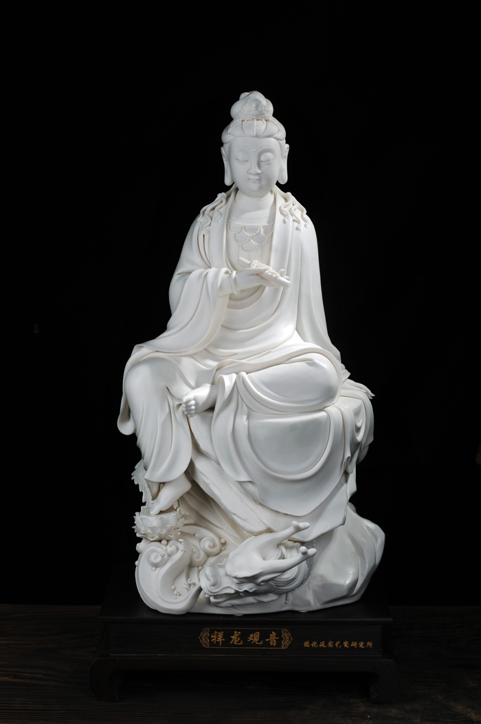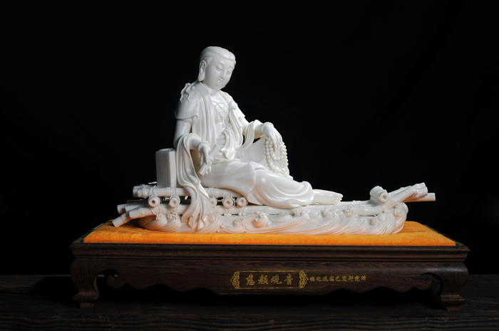 观音神态庄严安和,慈悲吉祥,雕工精致,特别难得的是底部竹排造型,其雕刻烧制工艺难度高,成品率低。本尊作品具有独创性、创新性,构思巧妙,富有时代感,以德化瓷艺、竹排、观音等元素,彰显上善若水、普渡慈航的观音文化,宣扬一带一路的海丝文化和海洋文化,祈福护佑共圆中国梦。作品限量99尊,具有极高的收藏价值。2015年7月3日被福建中国闽台缘博物馆永久收藏; 2016年1月获中国国际(北京)陶瓷艺术名家精品展‘金’奖。