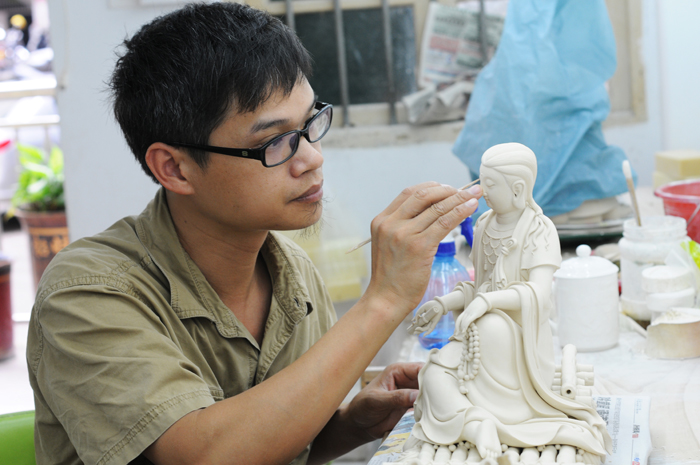 陈廷实先后师从数位瓷塑大师,经过10多年的苦心学艺,精通拉坯、塑像、雕刻、烧窑等高难技术,期间除了阅读大量的宗教、陶瓷、艺术类书籍,还四处拜访名师。所创作作品以观音、弥勒和古代神像为主,作品造型务实、严谨、质感强烈,并恰当地运用了线条在瓷雕中的表现力,结合德化陶瓷“白”、“润”、“饱满”等特性更好地加以展示,从立意到表现手段,在继承传统制作工艺基础上敢于创新。宝剑锋从磨砺出,梅花香自苦寒来,经过二十多年的学习创作,陈廷实作品多次在评比大赛中荣获金、银、铜奖,被数家博物馆、名寺院收藏,深受广大陶瓷艺术爱好者喜爱。