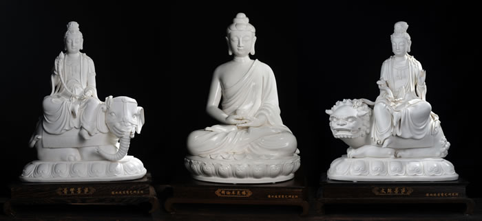 娑婆世界教化众生的释迦牟尼佛,左胁侍菩萨是以智慧闻名的文殊菩萨,右胁侍菩萨是以大行闻名的普贤菩萨,三者合称释迦三尊。作品文殊普贤通体洁净亮白,手持法器,端坐狮象之上,文静贤淑。五官刻画到位,冠饰、璎珞制作精美。如来大耳垂肩,面形丰满圆润,眉如弯弓,双目俯视,神态沉静内省。双手持禅定印,捧法器于膝上,安静祥和,潜心修炼。 作品在2016年8月山东济南24届珠宝玉石文玩艺术品展览会中被评为‘金’奖。