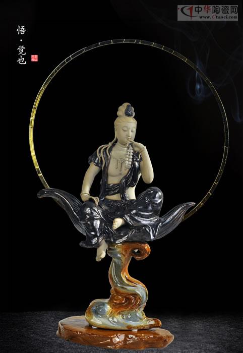 “这尊祥云观音在2012年11月荣获中国上海国际艺术节第十四届中国工艺美术大师精品博览会暨《中国工艺美术艺术优秀作品评选》金奖,是我们在色釉料配方研发创作出的又一件精品之作。”坤恒工艺品有限公司总经理柯国镇告诉我们。