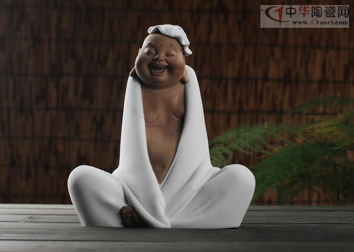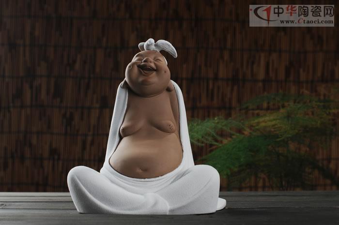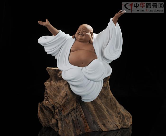当代德化实力派陶艺家郑志德作品,小弥勒坦胸露腹,笑容可掬,巧妙地应用紫砂泥作为肤色,喜鹊飞上眉梢,寓意“喜上眉梢”。