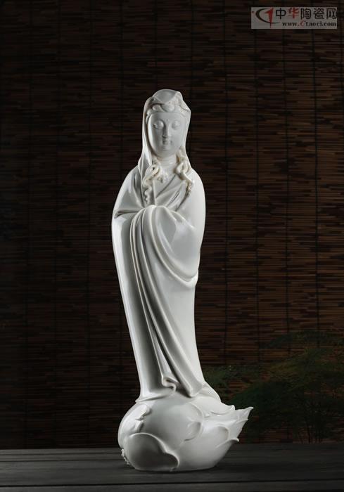 观音立于莲花之上,衣纹线条流畅飘逸,双目微闭,神情安详,形象传神。作品精雕巧塑,风格独特,经1300多度高温烧制,瓷质洁白,纯净温润,犹如脂玉。