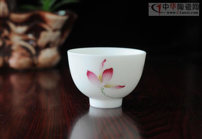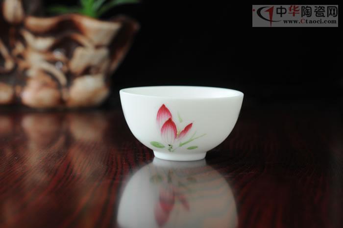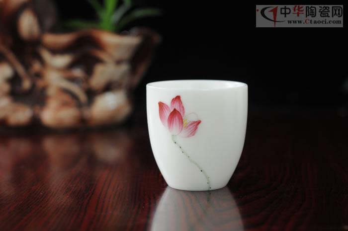 作品采用特级德化白瓷高岭土,3万/吨。手工玉瓷杯,珠圆玉润,执杯在手,光润洁白,如脂似玉,手感极佳,令人爱不释手,作品胎骨洁白,坚实致密,有凝脂似玉之感,迎光透视,色泽光润明亮,晶莹剔透,杯身手绘荷花,清新淡雅,集实用性、观赏性、收藏性于一体,是品茗佳选。